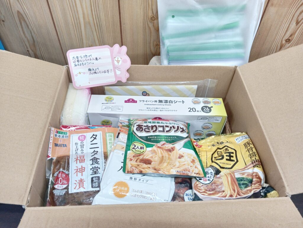 横浜の方からの食品寄付で、応援メッセージも添えられています。
